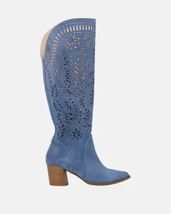Damskie kozaki wykonane z naturalnego zamszu w niebieskim kolorze to wyjątkowo kobieca i modna propozycja na sezon przejściowy oraz cieplejsze dni. Smukłe, szpiczaste noski nadają sylwetce lekkości i elegancji, a wysoki obcas typu słupek zapewnia stabilność oraz komfort podczas chodzenia. Cholewka ozdobiona jest efektownym, ażurowym wzorem inspirowanym motywem kwiatowym, który nadaje butom subtelności i oryginalnego charakteru. Połączenie wiosennego koloru, dekoracyjnych wycięć i klasycznej formy sprawia, że kozaki doskonale uzupełnią zarówno zwiewne sukienki, jak i dopasowane jeansy czy spódn