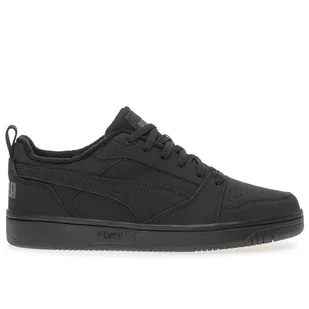 Buty męskie Puma Rebound V6 Low Nubuck 39747503 – czarne Męskie sneakersy Puma Rebound V6. Trampki męskie zainspirowane koszykarskim stylem dodadzą charakteru stylizacjom podczas dni w mieście. Cholewka wykonana została z połączenia skóry i materiału syntetycznego, które razem zapewnią trwałość i odporność buta na uszkodzenia. Posiada również perforacje na palcach co pomaga utrzymać suchość stopy. Wkładka Softfoam+ dba o odpowiednią miękkość i amortyzację na każdym kroku.