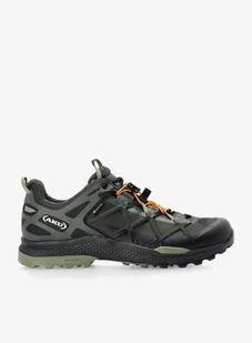 Buty AKU Rocket DFS GTX - military green/black - najważniejsze cechy: Model ma niską cholewkę;Cholewka wykonana z wytrzymałej tkaniny syntetycznej;Wstawki z mikrofibry w cholewce;Buty mają gumowy print 3D z przodu i po bokach;Podwójny system wiązania Dual Fit System zapewnia lepsze dopasowanie;Model ma wodoodporną membranę GORE-TEX® Performance Comfort;GORE-TEX® odpowiada również za oddychalność butów;Wewnątrz znajduje się dopasowana wkładka Ortholite® Hybrid;Wkładka uzyskana częściowo z materiałów z recyklingu;Wkładka zapewnia sprawne odprowadzanie wilgoci;Śródpodeszwa z pianki PU o podwójnej gęstości zapewnia amortyzację wstrząsów;Wkładka usztywniająca z polipropylenu o grubości 2 mm oraz z pianki EVA;IMS2, czyli konstrukcja łącząca się z śródpodeszwą i zapewniająca odpowiednią równowagę i amortyzację;Model korzysta z rozwiązania AKU Elica;Podeszwa Vibram® Rocket Traction Lug Megagrip® o dobrej przyczepności do podłoża.