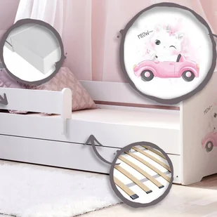 do 110 kg • Stelaż FLEX z elastycznych listew • Duża, wysuwana szuflada • Wysokiej jakości płyta meblowa • Certyfikowane, bezpieczne materiały • Produkt do samodzielnego montażu • Możliwość montażu barierki i szuflady po obu stronach Kompleksowe rozwiązanie do pokoju dziecięcego Bezpieczne, funkcjonalne i estetyczne – to łóżko to doskonała inwestycja w komfort Twojego dziecka. Dostosowuje się do gustów i potrzeb każdej rodziny.