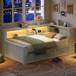 [Dużo miejsca do przechowywania]: Kilka bocznych półek pozwala na przechowywanie rzeczy w zależności od ich rozmiaru. Górna półka ma dwoje przesuwanych drzwiczek, idealnych do przechowywania rzeczy osobistych lub ochrony ich przed kurzem. Trzy szuflady pod łóżkiem zapewniają łatwe, bezpieczne i uporządkowane przechowywanie ubrań i pościeli, chroniąc je przed kurzem.