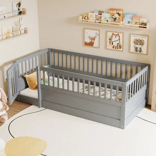 Unikalny design z drzwiczkami – To dziecięce łóżko z pojemnikiem jest wyposażone w barierkę bezpieczeństwa i małe drzwiczki, które otwierają się i zamykają, zapewniając bardziej zabawną, wygodną i bezpieczną przestrzeń do spania.