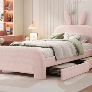 To łóżko zostało zaprojektowane z zagłówkiem w kształcie króliczka z kreskówki. Miękki materiał opakowania nadaje mu miękkości, dzięki czemu dzieci czują się jak w świecie pełnym bajkowych kolorów.