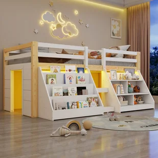 Tworzy kojącą atmosferę przed snem i służy również jako praktyczna lampka nocna. Podnóżek: Podnóżek do tego łóżka jest dobrze zaprojektowany, stabilny, bezpieczny, praktyczny i estetyczny. Jego szerokość i wysokość są idealnie dopasowane, aby zapewnić dziecku bezpieczeństwo i wygodę podczas wchodzenia i wychodzenia z łóżka.