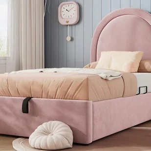 Zagłówek tego tapicerowanego łóżka ma stylowy, różowy, półokrągły kształt łuku. Aksamitny materiał jest wytrzymały, a jednocześnie miękki, zapewniając wygodę podczas snu.