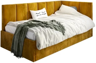 Łóżko młodzieżowe AURA 100x200 curry z tapicerowanym panelem L i pojemnikiem na pościel MKPOL