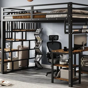 To piętrowe łóżko z kutego żelaza posiada praktyczne wbudowane biurko, idealne do odrabiania lekcji lub zajęć kreatywnych, nie zajmując dodatkowej przestrzeni.