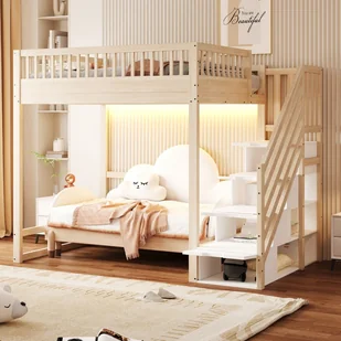 To łóżko piętrowe jest wyposażone w paski świetlne LED umieszczone pod spodem, które rozpraszają delikatne światło otoczenia, poprawiając widoczność w nocy i tworząc ciepłą i komfortową atmosferę. Delikatne światło idealnie nadaje się do czytania, relaksu lub bezpiecznego wykonywania nocnych czynności, eliminując potrzebę ostrego, bezpośredniego oświetlenia.