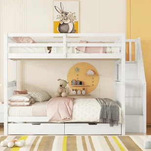 Dwie szuflady pod łóżkiem i wielopoziomowa półka schodowa zapewniają dużo miejsca do przechowywania. Niezależnie od tego, czy są to ubrania, zabawki czy książki, można je łatwo przechowywać, aby utrzymać porządek w pokoju.