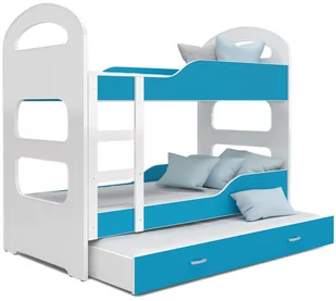 Łóżko piętrowe dziecięco-młodzieżowe Dominik. wszystkie krawędzie łóżka zaokrąglone - promień R2 materac piankowy FDM - dobrany tak, aby dzieciom spało się wygodnie i komfortowo pokrowiec Standard - ze wszytym zamkiem, dzięki czemu w razie potrzeby poszycie można zdjąć i wyprać płyta meblowa - stabilna i wytrzymała konstrukcja wykonana z najwyższej jakości płyty meblowej stelaż Flex wykonany z listew sprężynujących, które poprawiają komfort spania pojemna szuflada wysuwana na kółkach, mogąca służyć jako pojemnik na pościel lub zabawki (szuflada jest oddzielnym elementem łóżka) barierka ochronna - dziecko będzie spało bezpiecznie przez całą noc przy pierwszym montażu należy wybrać stronę zamontowania drabinki łatwy i szybki montaż - do każdego naszego łóżka dołączono zestaw montażowy oraz instrukcję w zestawie: łóżko szuflada wysuwana na kółkach stelaże pod materace 3 materace piankowe zdejmowane pokrowce na materace kolor: biały, niebieski materiał: płyta meblowa powierzchnia spania: