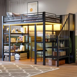 Wielofunkcyjne łóżko piętrowe: To solidne łóżko piętrowe ma żelazną ramę z paskami LED z trzech stron i gniazdkiem elektrycznym przy biurku, dzięki czemu nadaje się zarówno do użytku domowego, jak i profesjonalnego.