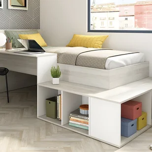 Łóżko RIGALI to doskonałe rozwiązanie umożliwiające optymalizację przestrzeni w pokoju dziecięcym nadając mu praktycznego charakteru. Wyposażone w przestronne biurko i wnęki do przechowywania, to funkcjonalne łóżko pozwoli dziecku pracować w komfortowych warunkach zachowując jednocześnie porządek w pokoju.