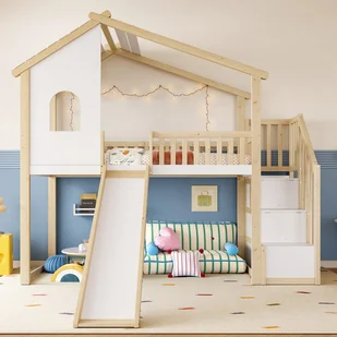 Drewniany domek w kształcie inspirowanym światem bajek, z jego eleganckimi płotkami, natychmiast zamienia pokój dziecięcy w mały świat marzeń, pozwalając dzieciom zasypiać każdej nocy w bajkowej atmosferze.