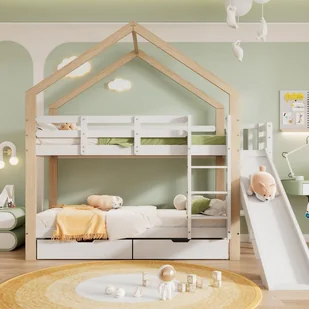 Łóżko piętrowe ze zjeżdżalnią i schodami:To łóżko piętrowe ma drabinkę, która pozwala dzieciom łatwo wchodzić i schodzić. Ze zjeżdżalnią do zabawy, to łóżko może zabawiać dzieci i oferować miłe wspomnienia z dzieciństwa.
