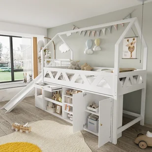 Łóżko piętrowe dla dzieci 90 x 200 cm - drewno lite - zjeżdżalnia, szuflady i szafka - białe