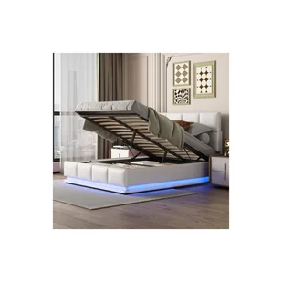 Łóżko tapicerowane 140x200 cm z oświetleniem LED i wbudowanym schowkiem, łóżko małżeńskie, łóżko dziecięce, białe