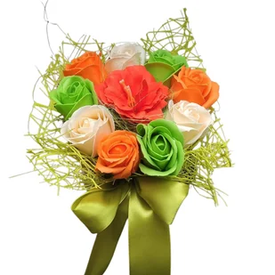 Bukiet kwiatów mydlanych w metalowej doniczce na imieniny, urodziny Ten pogodny bukiet mydlany z kremowych, pomarańczowych i zielonych róż z dodatkiem wyrazi...