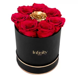 Flower box Infinity Rose - prawdziwe stabilizowane wieczne róże z serii: Golden Flower box Collection w czarnym boxie Na specjalne okazje przygotowaliśmy oszałamiający flower box z serii Golden. Tę ekskluzywną kompozycję kwiatową tworzą klasyczne czerwone róże oraz złota róża w sercu bukietu, dodając mu luksusowego blasku. Czerwony kolor róż podkreśla wyjątkowo gorące uczucia, energię oraz witalność. Całość dopełnia czarne, przyjemne w dotyku i wykonane z najwyższą starannością pudełko ze złotymi zdobieniami.