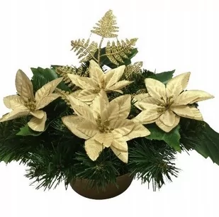 SZTUCZNY STROIK, GOTOWA wiązanka z kwiatami - GWIAZDA BETLEJEMSKA złota ✅ PODKŁAD SZTUCZNY - W DONICY GOTOWY STROIK na cmentarz ✅ ⭐ Doniczka - średnica 15 cm...