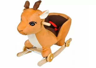 ŚPIEWAJĄCY BUJAK na BIEGUNACH i KÓŁKACH 3w1 JELONEK 3w1, zabawka pełni funkcję bujaka i jeździka + GRA MELODIE posiada wysokie i bezpieczne oparcie dodatkowe koła, po ich opuszczeniu bujak zamienia się w jeździk przycisk do muzyczki w uszach zapięcie zabezpieczające przed wypadnięciem Zabawka wykonana jest z miękkiego i miłego w dotyku pluszu. Bujak jest wyposażony w kółka schowane na płozach, dzięki czemu szybko można go zmienić w wygodny jeździk. Dla bezpieczeństwa bujak wyposażony jest w fotelik z paskiem zabezpieczającym malucha przed wypadnięciem. W głowie pluszaka zamontowane są mocne rączki ułatwiające utrzymywanie równowagi podczas zabawy. Posiada wbudowany głośnik, z którego wydobywa się miła dla ucha wesoła melodyjka.
