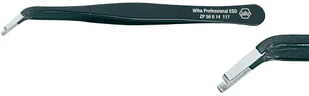 Normy: IEC 61340-5-1 $128 Rodzaj końcówki: wygięte pod kątem 35°, szeroki czubek ok. 2 mm, uformowany koniec chwytający do średnicy 0,8 mm $129 Wykonanie: gładkie powierzchnie chwytające, uchwyty z poprzecznymi nacięciami. Bezodbłyskowa, pokryta czarnym lakierem, antystatyczna. Antymagnetyczna i kwasoodporna. Odporność powierzchniowa 10^6 - 10^9 Ohm $130 Materiał: specjalna stopowa stal nierdzewna, chromowo-niklowa $131 Zastosowanie: Specjalistyczna pęseta SMD służy do chwytania i przytrzymywania elementów w poziomie.