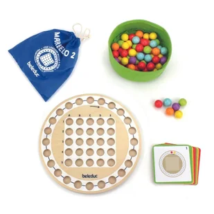 Dla kogo? Marbelino - Gra we wzory to zestaw składający się z 87 elementów: kulek w 6 kolorach w poręcznym i wygodnym worku do ich przechowywania, planszy, kart aktywności oraz miseczki. Gra we wzory to najlepsze połączenie nauki i zabawy. Daje możliwość wykorzystania całości lub poszczególnych elementów w różnoraki sposób. Dzięki temu zapewnia stymulującą zmysły rozrywkę zarówno młodszym, jak i starszym dzieciom.