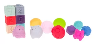 Sensoryczny zestaw dla dzieci od 6-go miesiąca życia. Zestaw składa się z piłeczek, klocuszków i dwóch zwierzaczków, wykonanych w 100% z nieszkodliwych dla dziecka materiałów. Elementy zestawu pobudzają wyobraźnię, umysł, wzrok i słuch. Można je dowolnie zgniatać, nabierając dzięki temu siły w rękach. Przy zgniataniu wydają dźwięki wzbudzając zainteresowanie dziecka. Zestaw składa się z dwóch zwierzaczków, 8 piłeczek i 6 klocuszków o różnych kolorach i fakturach. Zabawa różnymi elementami uczy rozpoznawania kolorów, kształtów i zwierząt oraz liczb. Klocuszkami i piłkami można bawić się nawet podczas kąpieli.