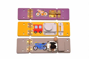 zestaw - 3 sztuki małych drzwi Kolor: odcień fioletowy, żółty, szary - małe drzwi ze sklejki z złotą zasuwką - odcień fioletowy - wymiary: całkowita wysokość 50 mm - szerokość 210 mm - małe drzwi ze sklejki z białą zasuwką- odcień żółty - wymiary: całkowita wysokość 60 mm - szerokość 210 mm - małe drzwi ze sklejki z srebrna zasuwką z kluczykiem - odcień szary - wymiary: całkowita wysokość 60 mm - szerokość 210 mm - materiał sklejka grubości 6 mm - zamontowane zawiasy - wycinane wysokiej klasy laserem - elementy szlifowane - do drzwi dołączone wkręty do montażu malowane ręcznie ekologicznymi farbami akrylowymi z atestem dekory naklejki z pianki - rower, autko, motocykl Na naszych aukcjach znajdziesz bogatą ofertę dekorów do tablicy sensorycznej, manipulacyjnej - Zapraszamy :
