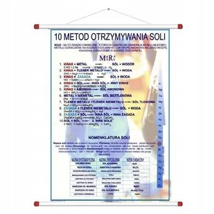 Zasady nomenklatury soli. Przykładowe zestawienie nazw systematycznych i zwyczajowych. . Szereg napięciowy metali. . INFORMACJE TECHNICZNE Wymiary planszy po rozwinięciu – 120 cm x 90 cm. Pokrycie: nadruk na tkaninie banerowej Plansza zwijana na wałkach plastikowych zaopatrzonych w linkę umożliwiającą jej zawieszenie, oraz w tasiemki służące do związywania gdy zachodzi potrzeba przechowywania planszy zwiniętej/vide mapy/.