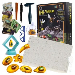 Zalane w bursztynie figurki doskonale je odwzorowują! Czy uda mu się wykopać je wszystkie?Co zajdziesz w zestawie: Gipsowy odlewMłoteczekDłutoPędzelekOkulary ochronneLupaWoreczek na wykopaliskaStojak do prezentacji6 kart z charakterystyką owadów (po angielsku)W zestawie znajdują się kartyz opisami gatunków do wykopania. Zawierają ciekawostki na temat gatunków które znajdują się w wykopalisku. 6 kart opisuje 6 rożnych owadów, insektów. Dziecko może zapoznać się z nimi przed przystąpieniem do prac aby wiedzieć jakich gatunków szuka.
