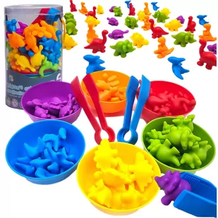 ZESTAW SKŁADA SIĘ Z: 48 dinozaurów w sześciu kolorach (każdy ok. 3-4 cm) 6 kolorowych miseczek (średnica ok. 8,3 cm) 2 x szczypce (dł. ok. 9,5 cm) Zestaw w estetycznym, kolorowym opakowaniu (tuba) doskonale nadaje się na prezent. Zabawka jest estetycznie wykonana i bezpieczna dla dziecka