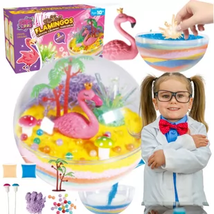 Po wyrośnięciu kryształu- wylewamy wodę z kubeczka 6. Następnie do jednej połówki akwarium wsypujemy trochę proszku, a na to układamy piankową połówkę 7. Wsypujemy resztę kolorowych proszków 8. Na koniec ozdabiamy nasze akwarium - kryształami, palmą, watą, flamingiem 9. Aby jeszcze bardziej urozmaicić nasze terrarium możemy dodać światełka, które są dołączone do zestawu! Nasze akwarium jest GOTOWE! Wiek +10 Wymiary opakowania:
