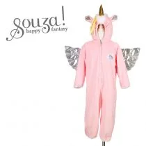 Kostium kombinezon kigurumi jednorożec holenderskiej marki Souza! to przepiękne przebranie dla dziewczynki. Ma kaptur, zapięcie na suwak i gumki przy rękawach oraz nogawkach. Jest wygodny i mięciutki. Zachwyca dbałością o detale. Na głowie (kapturze) ma uszka i duży złoty róg.