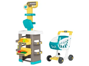 Sklep dla dzieci Smoby z wózkiem na zakupy Sklep to prawdziwy klasyk do pokoju dziecięcego – supermarket Smoby oferuje również wierny oryginałowi wygląd prawdziwego supermarketu i jest wyposażony w wózek na zakupy! Dzięki temu dzieci mogą w zabawie robić cotygodniowe zakupy. Tak jak w prawdziwym życiu, w uchwycie można umieścić monetę. Elektroniczna kasa fiskalna z wyświetlaczem Lcd, funkcją kalkulatora i skanerem z sygnałem dźwiękowym i świetlnym sprawia, że zakupy stają się prawdziwą zabawą. Dzięki mikrofonowi (bez funkcji) kasjer może kogoś zawołać, a rozkładana przegródka na pieniądze to świetne miejsce do przechowywania banknotów i monet. W ten sposób dzieci uczą się poprzez zabawę korzystać z pieniędzy.