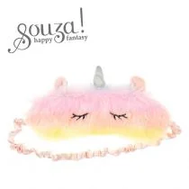 Puszysta maska do spania dla dzieci Mazarine holenderskiej marki Souza! Na różowym futerku ma wyszyte zamknięte oczy, a u góry – miękkie uszka i srebrny róg jednorożca. Gumka do zakładania jest obciągnięta jasnoróżową satyną i nie uciska. Idealna do spokojnego zasypiania, na nocowanie u znajomych. . .