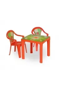 Zestaw: stolik i 2 krzesła + tablica . Kolor zestawu CZERWONY, wtopiona etykieta IML z kolorowym motywem w blat stolika i oparcie krzesła uniemożliwa jego odklejenie i gwarantuje wysoką odporność na warunki atmosferyczne, do stosowania zarówno na zewnątrz, jak i wewnątrz. Tablica kredowa z wyposażeniem (kreda biała + gąbka) o wymi. 35,5 x 28 cm.