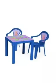 Zestaw: stolik i dwa krzesła, kolor Niebieski, wtopiona etykieta IML z kolorowym motywem w blat stolika i oparcie krzesła uniemożliwa jego odklejenie i gwarantuje wysoką odporność na warunki atmosferyczne, do stosowania zarówno na zewnątrz, jak i wewnątrz