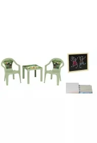 Zestaw: stolik i dwa krzesła, kolor pastel zielony, wtopiona etykieta IML z kolorowym motywem w blat stolika i oparcie krzesła uniemożliwa jego odklejenie i gwarantuje wysoką odporność na warunki atmosferyczne, do stosowania zarówno na zewnątrz, jak i wewnątrz. Tablica kredowa z wyposażeniem (kreda biała + gąbka) o wymi. 35,5 x 28 cm.