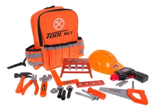 - plecak, - kask ochronny, - wkrętarko-wiertarka, - młotek, - kombinerki, - kątownik, - klucz nastawny, - piła, - nasadka do śrubokręta, - wymienne końcówki do śrubokręta: płaska lub krzyżak, - wymienne bity do wiertaki: płaska, krzyżak, wiertło, - 3 x śrubki, - 3 x nakładki, - 3 x kołek, - plastikowa deseczka do wkręcania śrubek, - stoliczek do wkręcania śrubek. |