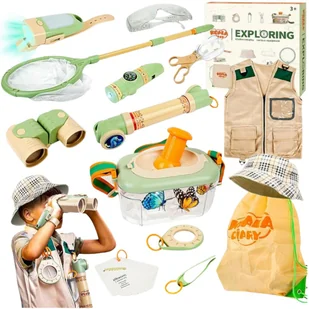 3 x bateria guzikowe AG13 (w zestawie baterie testowe) oraz 3 x bateria AAA 1,5V (brak w opakowaniu) Wymiary opakowania: 32×32×10 cm ☘️Zawartość zestawu Kamizelka odkrywcy z kieszonkami Kapelusz przeciwsłoneczny Siatka na owady Pojemnik z obrotową lupą (360°) Lornetka składana Peryskop Latarka LED (z trybem SOS i bocznym światłem) Gwizdek 3w1 (gwizdek, latarka, kompas) Lupa Pinceta Pęseta Szczypce do owadów Karty edukacyjne z nazwami owadów (język angielski) Notes do obserwacji Okulary ochronne Worek/plecak z logo Elastyczne opaski Pasek z karabińczykiem Kolorowe pudełko prezentowe ☘️Zalety produktu ✔️ Zachęca do aktywności na świeżym powietrzu – dziecko spędza czas na dworze, odkrywając przyrodę ✔️ Uczy przez obserwację i działanie – dzieci mogą dokumentować cechy owadów na specjalnych kartach ✔️ Rozwija ciekawość i pasję do nauki – idealny zestaw startowy dla małych przyrodników ✔️ Bezpieczne i lekkie materiały – idealne dla dzieci już od 3. roku życia ✔️ Ruchome i funkcjonalne akcesoria – jak latarka z obrotem 360° czy siatka teleskopowa ✔️ Dla chłopców i dziewczynek – uniwersalna kolorystyka i tematyka ✔️ Idealny na prezent – zapakowany w estetyczne pudełko ❓ FAQ Czy zestaw można używać samodzielnie przez dziecko? Tak, jednak dla dzieci poniżej 6 lat zaleca się nadzór dorosłych podczas użytkowania. Czy latarka ma baterie w zestawie? Nie, baterie należy dokupić osobno (informacje o rodzaju baterii znajdują się na opakowaniu). Czy kamizelka pasuje na każde dziecko? Kamizelka ma uniwersalny rozmiar dla dzieci w wieku od 3 do ok.