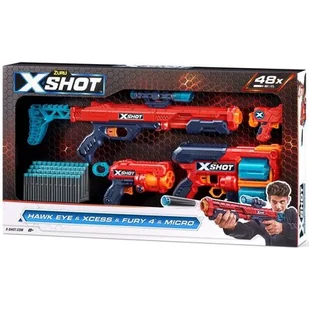 Zestaw wyrzutni ComboEpicki pakiet Combo X-Shot! Ten pakiet łączy w sobie celność Hawk Eye, podwójne magazynki Xcess, szybkość Fury 4 i zdolność podstępu Micro! Ta kombinacja łączy 4 różne wyrzutnie, aby stworzyć najlepszy asortyment do każdej bitwy. Pakiet combo uzupełniony. . .