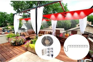 Zestaw ten służy do tworzenia schładzającej mgiełki wodnej - posiada 8 mikrodysz z ustawianym kątem (w tym jedna końcowa), 15 metrów węża, który po docięciu umożliwia umieszczenie dysz w zależności od indywidualnej potrzeby, 5 klipsów do zawieszenia i adapter do podłączenia wody. Bardzo szybka i prosta instalacja pozwala na podwyższenie wilgotności w powietrzu, a tym samym obniżenie temperatury aż o 10 stopni. Zestaw jest odpowiedni do wykorzystania na pergolach, balkonach, tarasach, jak również do podwyższenia wilgotności w szklarniach lub przestrzeniach przeznaczonych dla zwierząt. Jakość działania jest zależna głównie od ciśnienia w zestawie doprowadzającym, zalecamy ustawienie dysz w taki sposób, by wilgoć nie opadała bezpośrednio na osoby, śliskie powierzchnie, które stwarzają ryzyko poślizgnięcia lub na przedmioty, dla których nadmierna wilgoć jest szkodliwa.