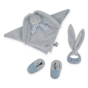 Uroczy zestaw prezentowy 3 w 1 Królik francuskiej marki KALOO to idealny pierwszy podarunek dla niemowlaka, bezpieczny od pierwszych dni życia. Zawiera piękne i perfekcyjnie wykończone akcesoria w pastelowych odcieniach koloru niebieskiego: kwadratowy dwustronny komforter z główką króliczka, silikonowy dwustronny gryzak (gładki + fakturowany) z długimi uszami oraz miękkie kapciuszki z króliczym pyszczkiem i uszkami. Zabawki wspierają rozwój sensoryczny dziecka, m. in. chwytanie czy ugniatanie, przynoszą ulgę w trudnym okresie ząbkowania oraz pomagają się wyciszyć.