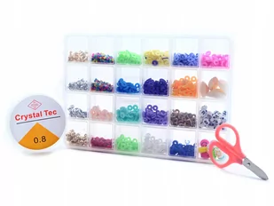 KORALIKI W PUDEŁKU ogromny wybór wzorów oraz kolorów koralików, 24 rodzaje kolorowych koralików, dwie szpulki silikonowej gumki, całość zapakowana w poręczny organizer. Odkryj magiczny świat twórczej zabawy! Nasze pudełko pełne koralików to idealny sposób, aby rozwijać zdolności wizualne i manualne Twojej dziewczynki. Dzięki temu zestawowi, stworzysz mnóstwo niepowtarzalnych bransoletek, które będą przyciągać uwagę wszystkich wokół. Wykorzystaj swoją wyobraźnię i kreatywność, aby stworzyć niezwykłe wzory i połączenia kolorów. Nasz zestaw koralików to również doskonały sposób na tworzenie niezapomnianych prezentów dla bliskich.