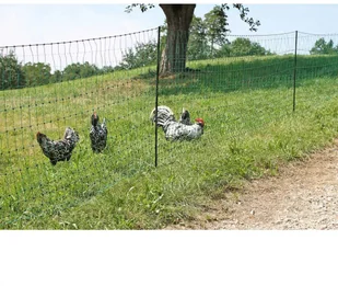 Ta elektryczna siatka ogrodzeniowa dla drobiu firmy Kerbl została zaprojektowana z myślą o kurach, gęsiach i indykach. Siatka ma 50 m długości i 112 cm wysokości. Posiada spawane łączenia (supły) i wzmocniony pas górny. Szerokość oczka jest szczególnie wąska w dolnej części siatki i zabezpieczona stabilnymi plastikowymi słupkami, które są wyraźnie widoczne. Ten model jest odpowiedni również dla jagniąt.