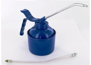 Nowy Mosiężna pompaLakierowany na niebiesko metalowy zbiornikZ metalową stałą wylewką i elastyczną wylewką. Standardowa olejarka Pressol - 350 ml - niebieska, rurka rozpylająca EWMP i elastyczna rurka