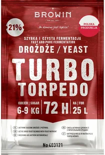Nowa, ulepszona receptura! Drożdże gorzelnicze Turbo Torpedo 72 h, fermentują aż do 21% alkoholu. Moc do 21% alkoholu - nowa receptura drożdży i pożywek pozwala osiągnąć aż do 21% alkoholu. Do nastawów z różnych surowców - drożdże Turbo torpedo 72 h są idealne do fermentacji cukru, owoców, kukurydzy, jęczmienia, żyta, pszenicy, ziemniaków, melasy. Fermentacja w 72 h - do przefermentowania 6 kg cukru drożdże potrzebują jedynie 3 dni. Porcja na 6-9 kg cukru - ilość cukru, jaką dodaje się do fermentacji, zależy od stężenia alkoholu, jaki chce się uzyskać w nastawie.