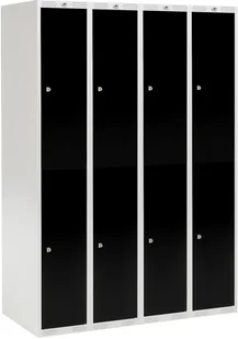 Szafa schowkowa CLASSIC, 4 moduły po 2 schowki, 1740x1200x550 mm, czarny. Szafa na rzeczy osobiste - 4 sekcje, każda z 2 dużymi schowkami wyposażonymi w drążki na wieszaki ubraniowe. Wzmocnione drzwi na zawiasach, z gumową amortyzacją zapewniającą ciche zamykanie. Otwory wentylacyjne w górnej i dolnej części. Wiele podstaw do wyboru.