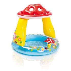 Piękny basen dla dzieci z dmuchanym dnem i daszkiem w kształcie muchomora.