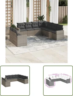 9-częściowy zestaw sof ogrodowych z poduszkami z szarego polirattanuTen zestaw sof ogrodowych jest idealnym dodatkiem do ogrodu, patio lub dziedzińca. Zapewnia wygodne i zachęcające miejsce do rozmów z rodziną i przyjaciółmi lub po prostu relaksu i cieszenia się życiem na świeżym powietrzu. Wytrzymały materiał: rattan PE, znany również jako polirattan, to wytrzymały, łatwy w pielęgnacji materiał syntetyczny o wyglądzie naturalnego rattanu. Charakteryzuje się niską wagą i jest łatwy w czyszczeniu.